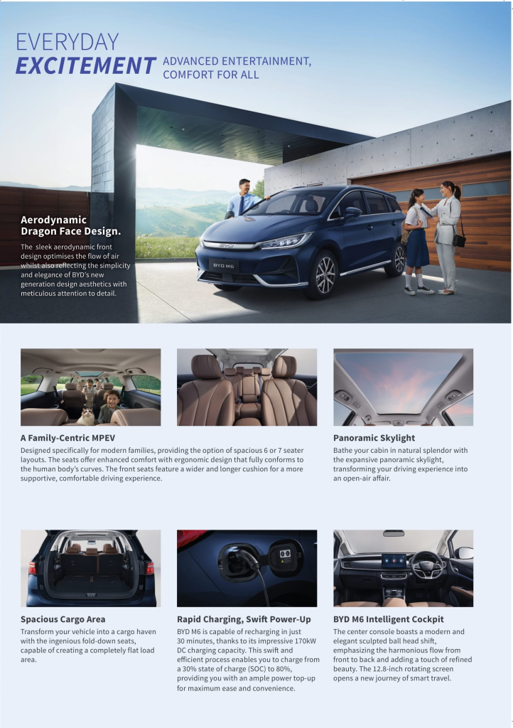 BYD M6 didukung kemampuan fast charging AC 7 kW dan DC hingga 115 kW serta dilengkapi dengan perangkat Vehicle to Load (V2L). Untuk fast charging, dari 10 – 80% hanya butuh waktu 40 menit.